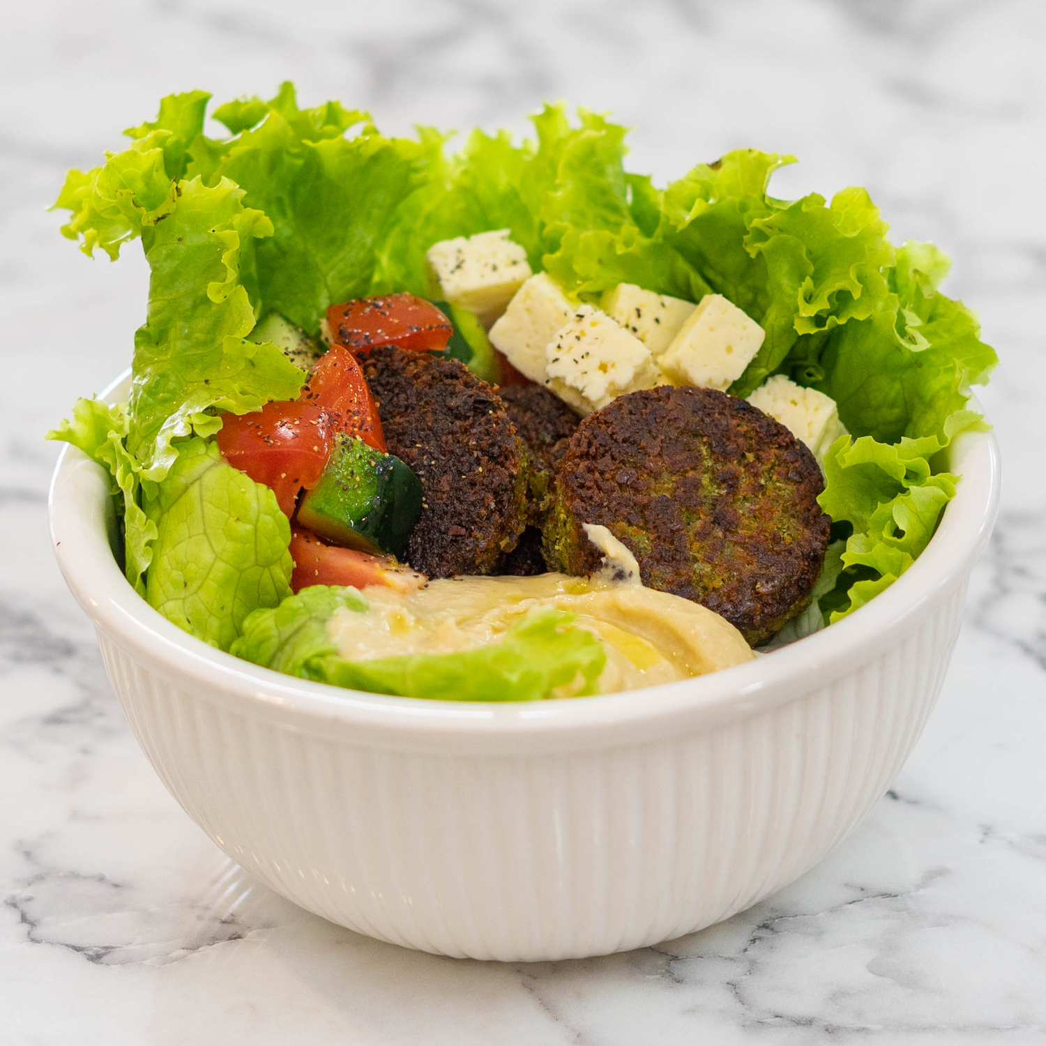 En una licuadora mezclar los ingredientes del aderezo, hasta obtener una consistencia de puré. En un plato aparte colocar las verduras en la ensalada y mezclar con el aderezo. Colocar los Falafel Kouzina y crutones encima y a disfrutar.