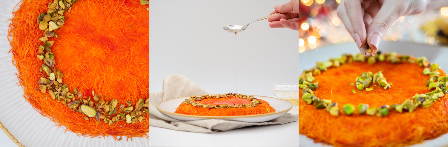 Postre suave y crujiente con capas de masa phyllo relleno de queso. Rociado con un sirope fragante y adornado con pistachos al gusto.